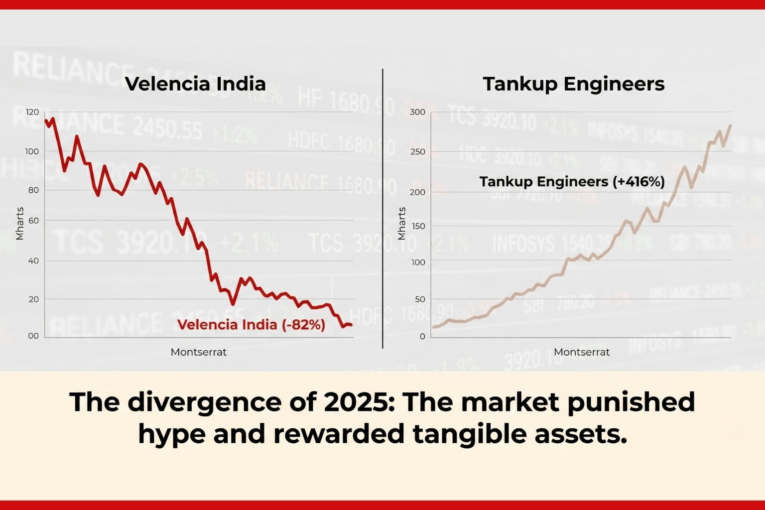 The "SME IPO Bubble" burst, wiping out wealth in weeks. Stocks like Velencia India crashed 82% from their listing price, while Logiciel Solutions plunged 70%. Yet, in the same market, companies like Tankup Engineers delivered returns of 416%.